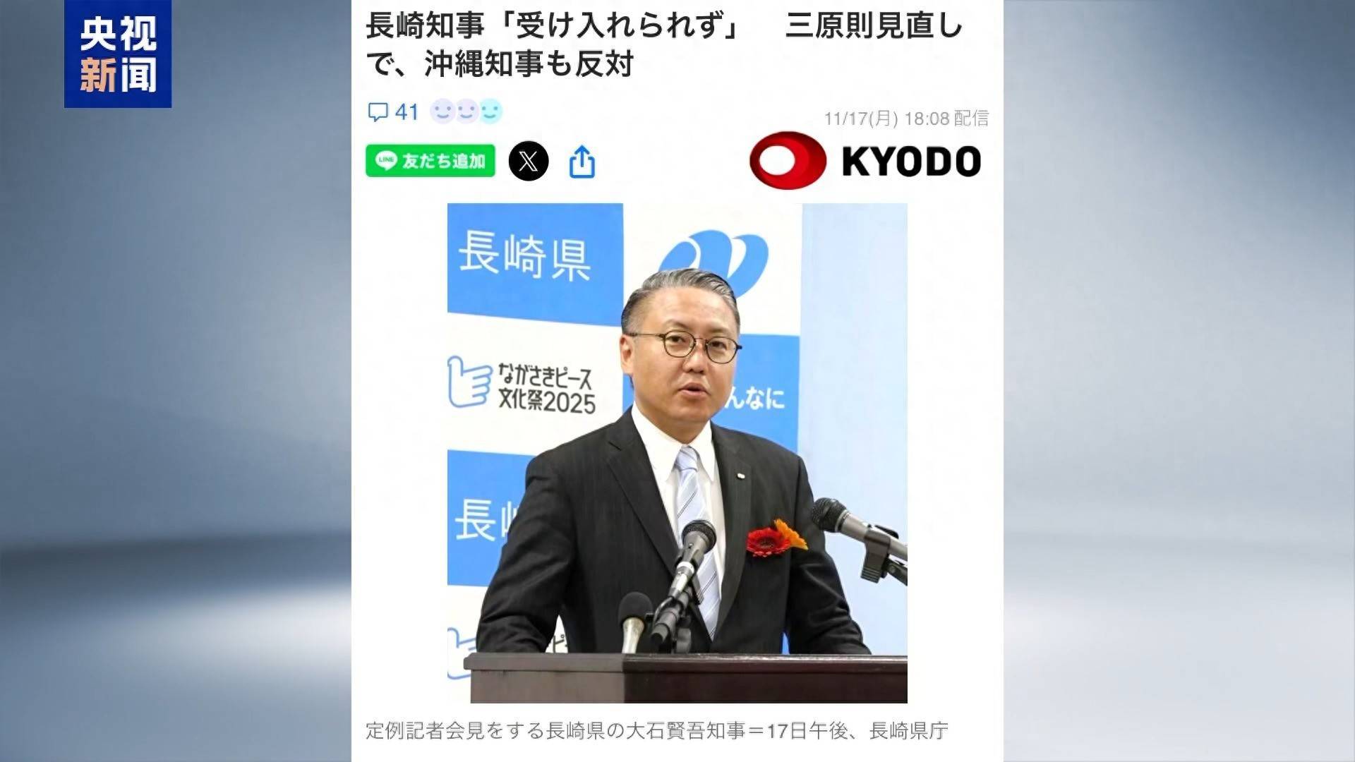 长崎县知事大石贤吾17日表示,日本政府长期以来坚守“无核三原则”,修改这一原则是明显的“逆行”,对于核爆受害地而言完全无法接受。