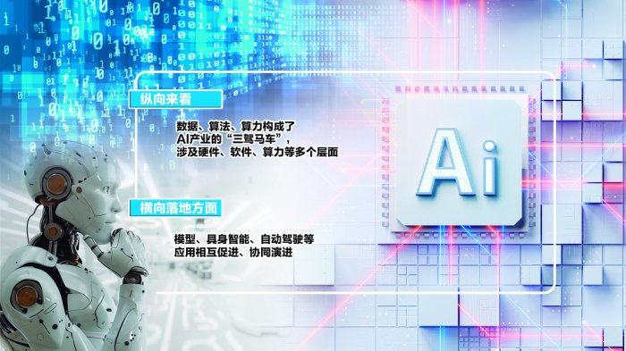 AI产业纵横交错,呈现多元化、多维度的格局。纵向来看,数据、算法、算力构成了AI产业的“三驾马车”,涉及硬件、软件、算力等多个层面。横向落地中,大模型、具身智能、自动驾驶等应用相互促进、协同演进。